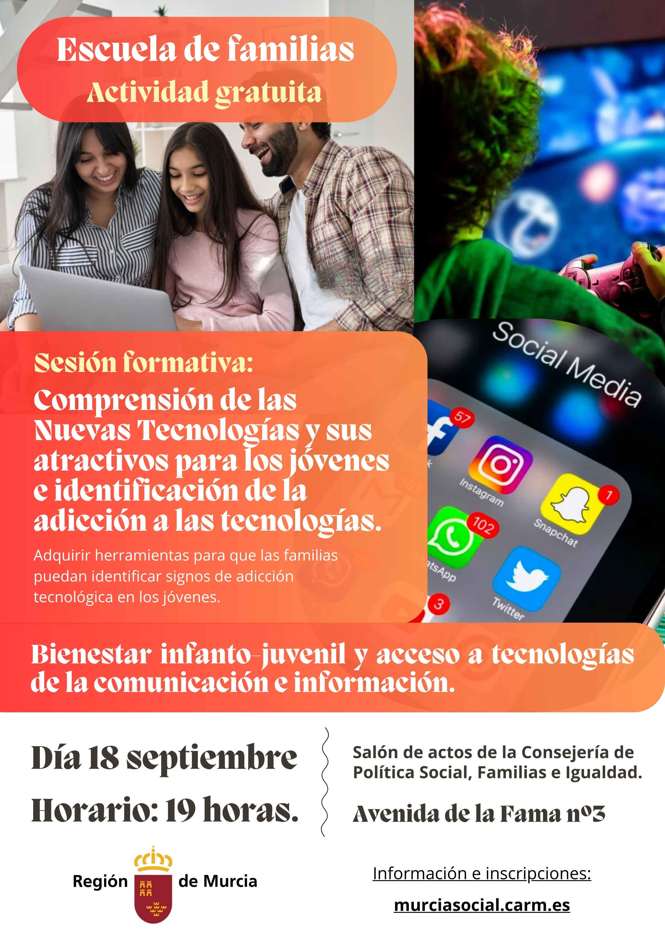 | Resumen : | Cartel informativo de la sesión formativa gratuita que se realiza con el objetivo de proporcionar herramientas para que las familias puedan identificar signos de adicción tecnológica en los jóvenes. |